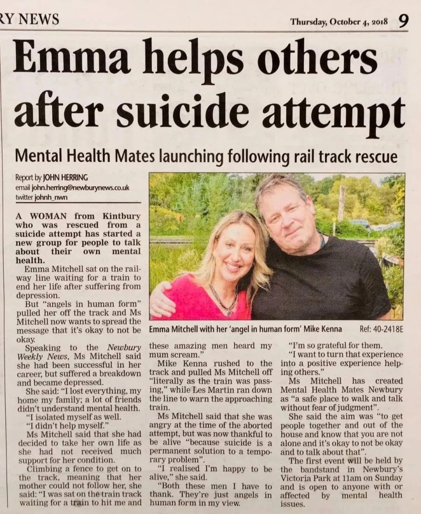 “Four years ago a stranger ran after me and sat with me on the train track trying to talk me off it and then pulled me off literally as the fast train approached, throwing us both into the bank. Angry at the time, as I thought that was the only to end my pain, I am now eternally grateful to him for giving me a second chance.”